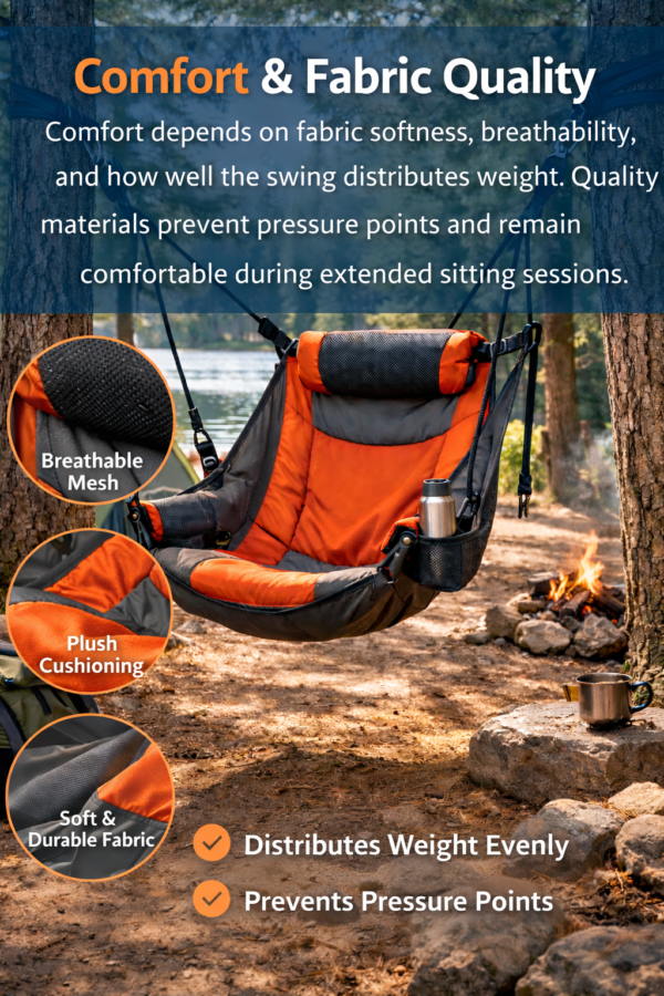 Comfort depends on fabric softness, breathability, and how well the swing distributes weight. Quality materials prevent pressure points and remain comfortable during extended sitting sessions. For the most comfortable camping chair, see the Helinox Savanna chair review.
