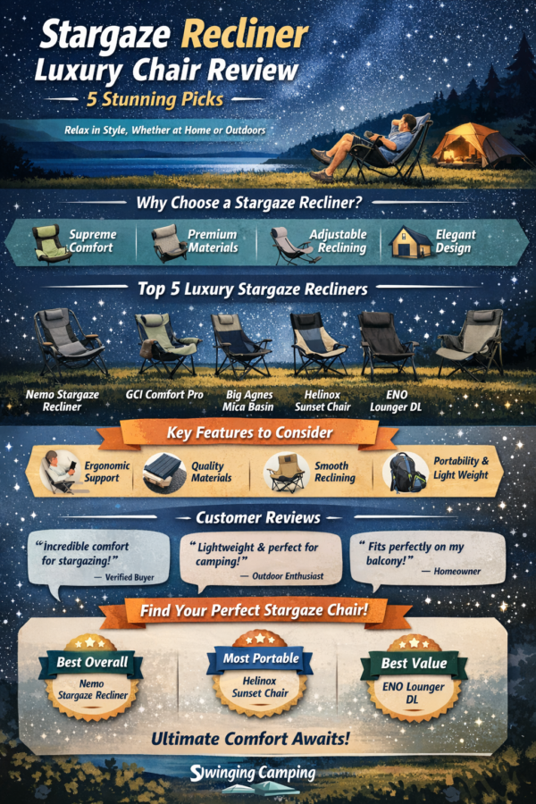 In this Stargaze Recliner Luxury Chair Review, we explore 5 stunning Stargaze recliners that balance luxury, ergonomics, and innovation, helping you pick the ideal chair for your home or outdoor adventures. If you’re looking for the perfect stargazing chair, this guide is all you need by Swinging Camping.