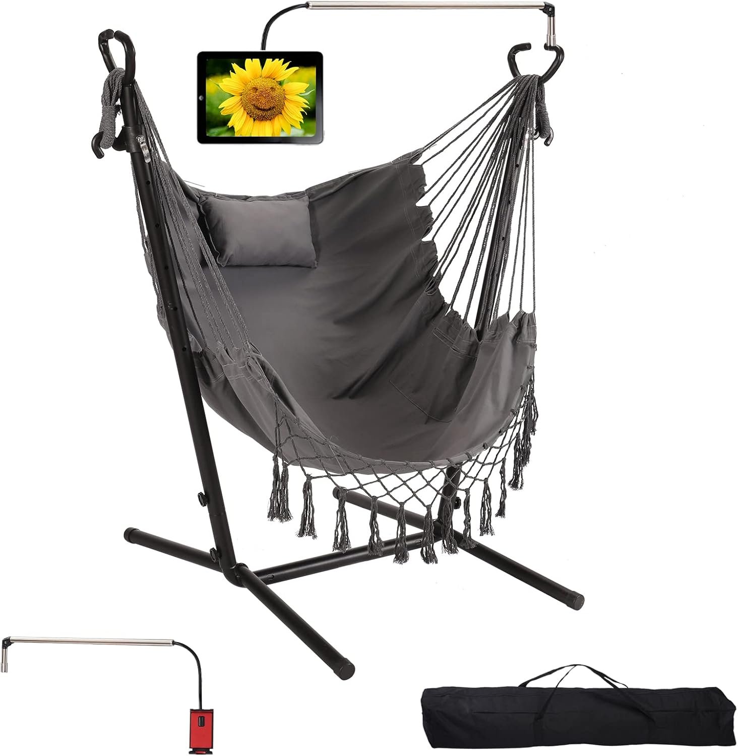 The intelligent 360° adjustable phone and tablet holder adds modern convenience, letting you enjoy hands-free streaming, reading, or video calls from any angle. Finished with stylish boho tassels, a practical side storage pocket, and an anti-rollover base for added safety, this hammock chair blends comfort, functionality, and aesthetic appeal—making it an ideal choice for personal use or as a thoughtful gift.